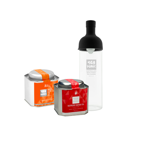 Cool down with a burst of fruit-filled freshness. This bundle includes Thirst Quencher Tea and Mango Elixir Tea in loose leaf caddy tins, plus a sleek glass bottle designed for brewing and serving iced tea in style. Perfect for sunny days, picnics, and effortless at-home refreshment. Simply brew, chill, and pour.