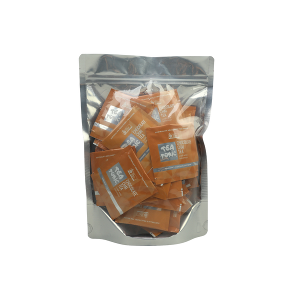 Ingredients: Black Tea (Camellia sinensis), Cacao Nibs (Arriba Criollo), Natural choc chai flavour, Cassia (Cinnamomum tamala), Monk fruit (Siratia grosvenorii), Ginger (Zingiber officinale), Cloves (Sysygium aromaticum), Black Pepper (Piper nigrum), Cardamom (Elettaria cardamomum).