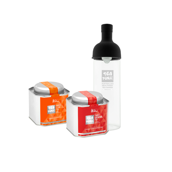Cool down with a burst of fruit-filled freshness. This bundle includes Thirst Quencher Tea and Mango Elixir Tea in loose leaf caddy tins, plus a sleek glass bottle designed for brewing and serving iced tea in style. Perfect for sunny days, picnics, and effortless at-home refreshment. Simply brew, chill, and pour.